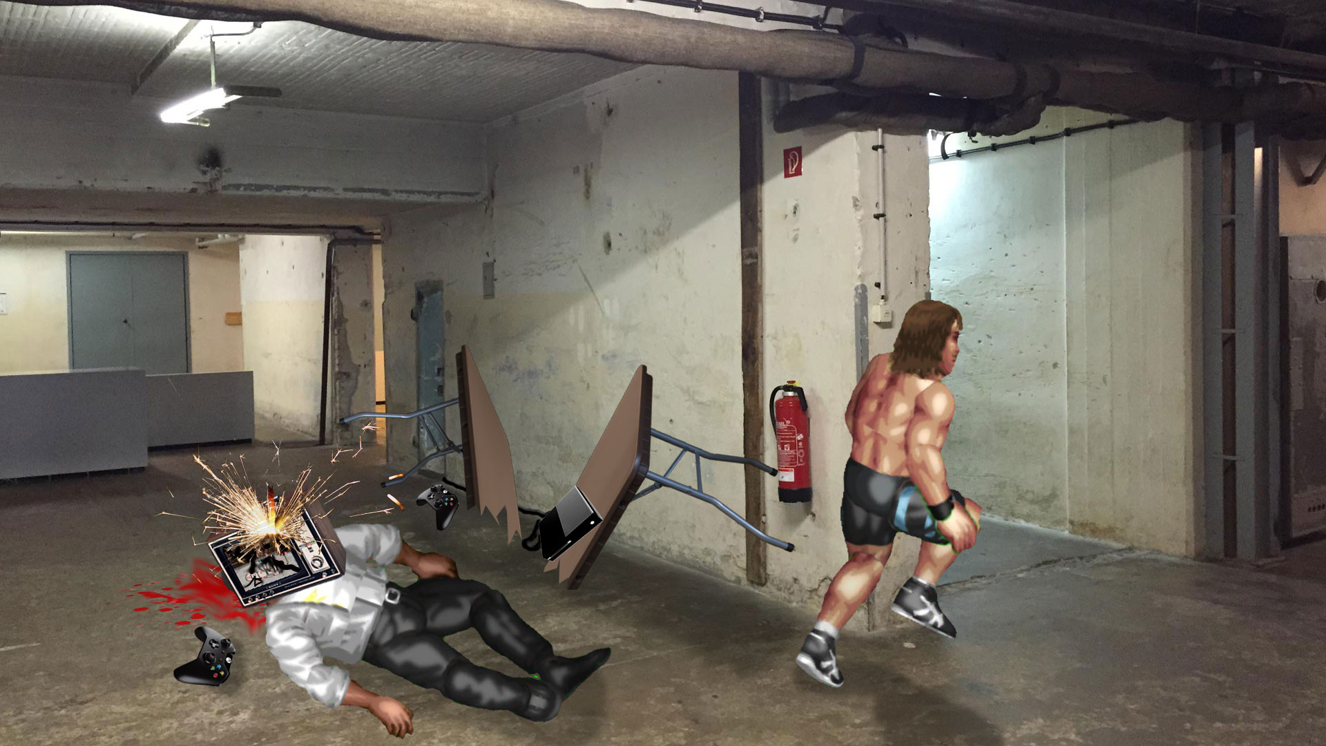 There isn’t a lot to say about the match between Bike and Bradford except it happened and when it looked like Bradford had the match won — via Bonzai Drop — Bike paused the game multiple times in his frustration of being unable to properly play the kick out mini-game, before rage quitting the match. He stormed off, but not before turning around and delivering a patented Bianchi flying knee to the ancient, CRT television that they were playing on. Well, a chain reaction happened from there, as the table buckled under the pressure and the television flew off of the table, hitting Bradford in the head, squashing him to the ground in a puddle of his own blood.