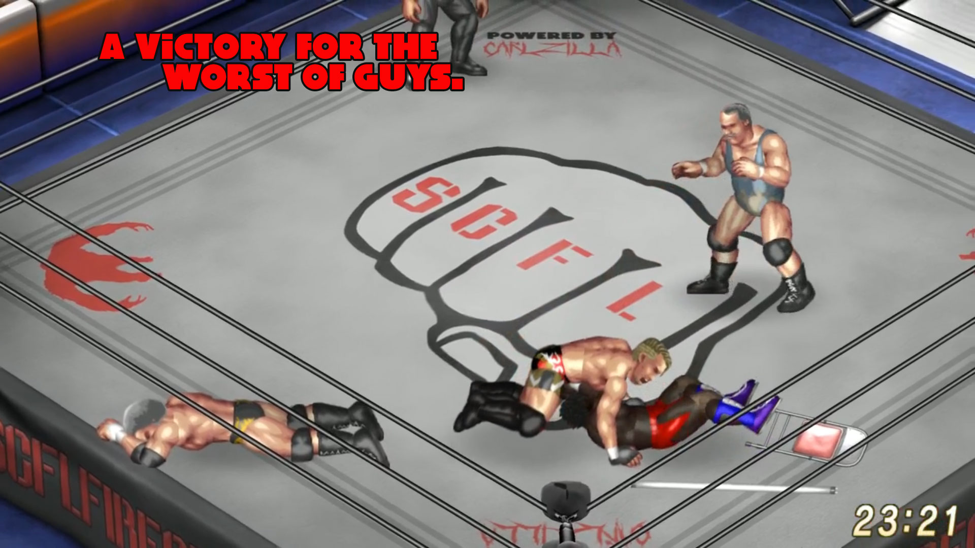 The Bruisers (Justice Turner/Blowhole Bernard) secured their SCFL Pro Hardcore Tag Championships yet again, this time with a win over the High Seas in dominating fashion. Something, of course, strange happened, as before the Fixers could tear down the deathmatch paraphernalia, it looks like Garden Greene, upset over Wim Nijman granting a shot to carnivore Patty Acosta before him, assaulted Wim Nijman, the action spilling into the ring as Wim was busted open by the time our cameras got to him. The SCFL Pro US Championship was defended in an impromptu deathmatch, with knives everywhere, as Garden Green and Wim Nijman battled for over 20 minutes before Wim made a heroic comeback after losing Front Reed levels of blood to tap out the vegan.